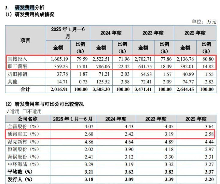 与之相对应,同时期研发费用中职工薪酬分别为786.06万元、359.23万元,占比分别仅为22.42%、17.81%,对比来看,2024年金雷股份、派克新材、恒润股份、中环海陆职工薪酬占研发费用比例分别为45.87%、33.34%、48.84%、27.41%,那么公司研发人员薪酬占比较低是何缘故?另外两家同行海锅股份、通裕重工分别为18.72%、19.05%,与公司大体相当,三家公司业务类型是否相似?需要北交所进一步问询。