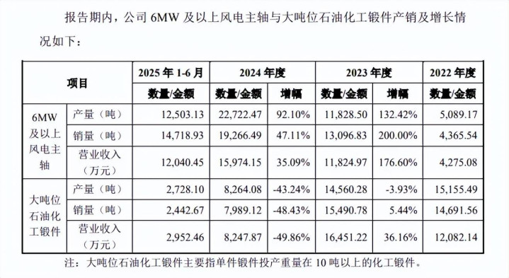 进一步来看,报告期6MW及以上风电主轴产量分别为5,089.17吨、11,828.50吨、22,722.47吨、12,503.13吨,呈现增长态势,而大吨位石油化工锻件则反其道而行,分别为15,155.49吨、14,560.28吨、8,264.08吨、2,728.10吨,2023年、2024年分别下滑3.93%、43.24%,去年上半年预估进一步下滑,这种情况下扩产是否具备必要性?
