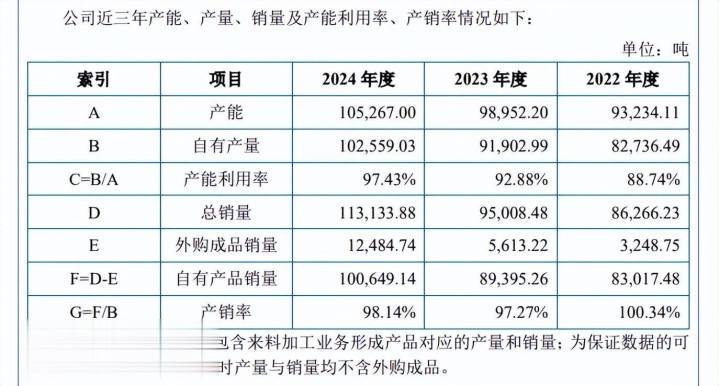 2022年至2024年,公司产能利用率分别为88.74%、92.88%、97.43%,本次扩产产能是2024年产能105,267吨的47.5%,即扩产步伐较大,产能消化问题需要引起重视。